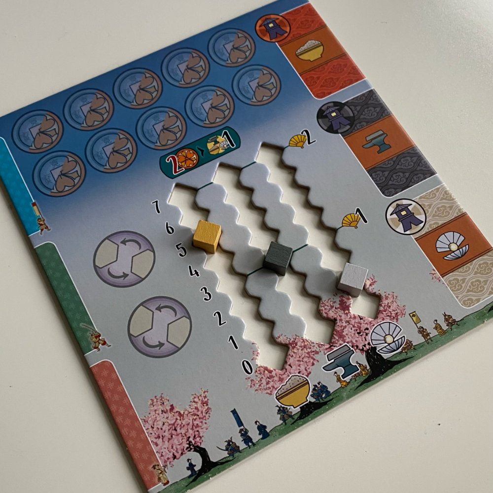 - Ogród, w którym gracz może wydać 2 lub 5 Żywności by umieścić pieczęć klanu na dostępnym, pustym, wybranym przez siebie polu, by następnie otrzymać bonus z kolumny w której znacznik został umieszczony